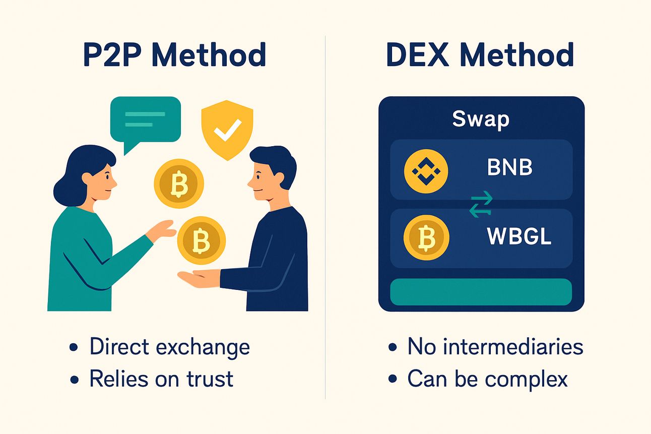 Since Bitgesell is not yet listed on centralized exchanges, there are currently two primary ways to acquire BGL: through peer-to-peer (P2P) transactions or via decentralized exchanges (DEXs) followed by conversion to the native chain.